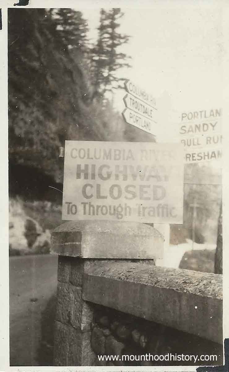 One of the photos clearly shows road signs with familiar destinations – Portland, Sandy, Bull Run, Gresham, Troutdale and the Columbia River Highway. The best part of the photo is the additional temporary sign that reads “Columbia River Highway Closed To Through Traffic” placed in on top of one of the road’s stone and concrete guard rails. The second one shows some stone rubble along a roadway which looks much like a winter day at unstable spots along the old road today.