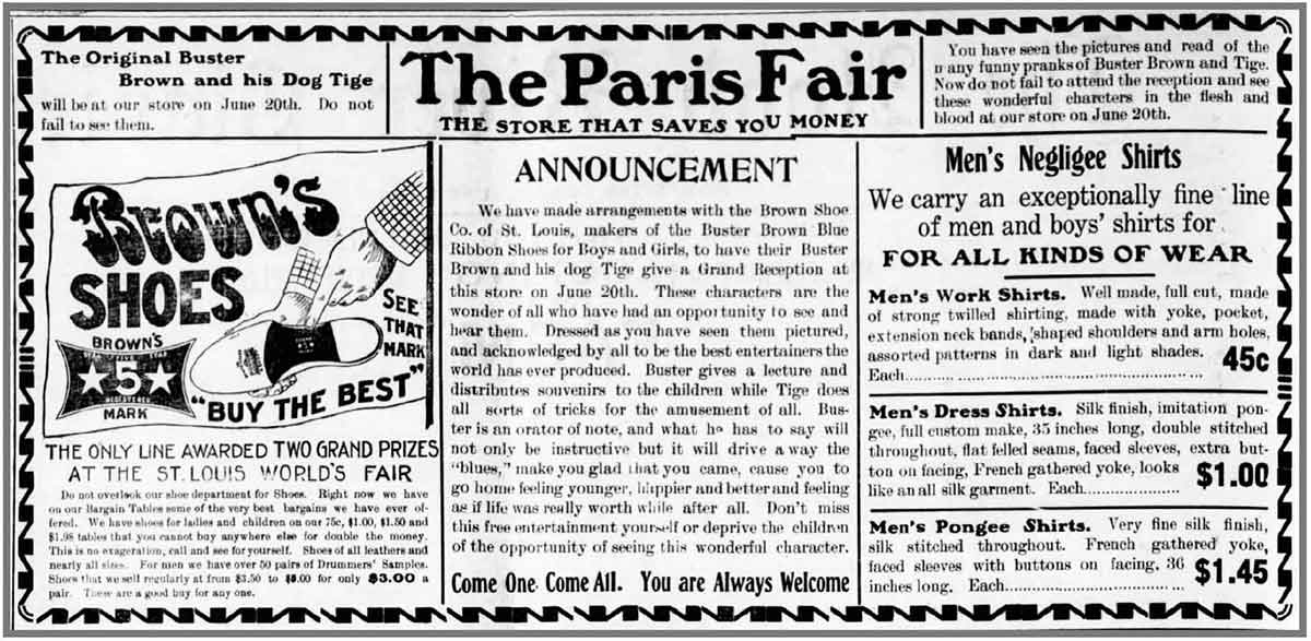 Soon after the Brown Shoe Company adopted their new mascot, signing a licensing agreement with Outcault at the 1904 St. Louis World’s Fair, they created a campaign where Buster Brown and his dog Tige would make public appearance at shoe stores around the country. They would use Little People to act the part of Buster Brown. Young and old would come to these events to see Buster Brown, and many pair of shoes were sold. It was so successful that Buster Brown shoes have been popular beyond extent of the life and popularity of the cartoon character Buster Brown and are still a popular brand of children’s shoe today.
