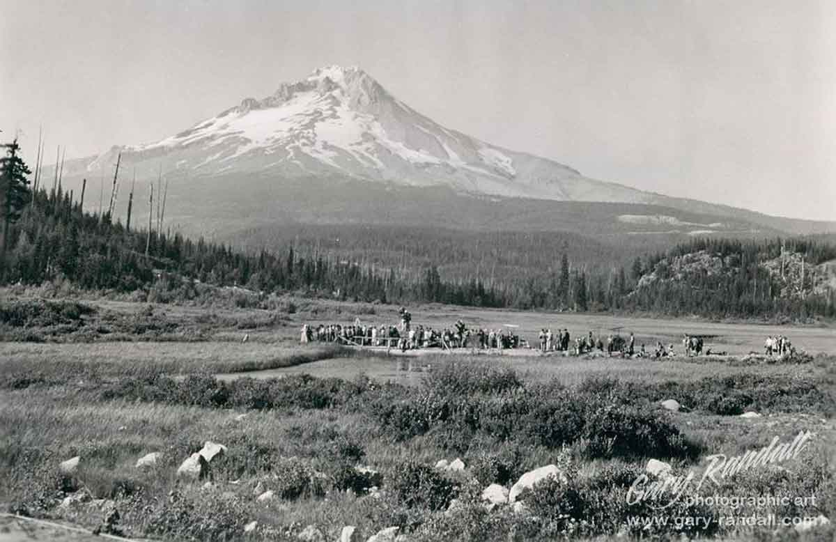 Mud Lake in 1951 during the filming of Bend of The River with James Stewart, Arthur Kennedy, Julie Adams, and Rock Hudson. Mud Creek will be dammed to become Trillium Lake about nine years later in 1960 during the development of camping and recreational facilities.