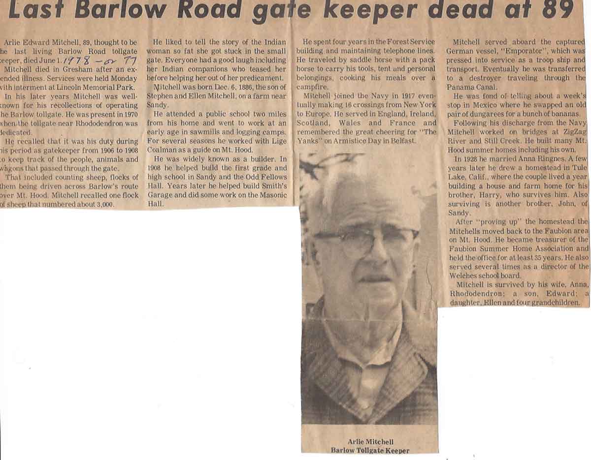 In his later years Mitchell was well known for his recollections of operating the Barlow tollgate. He was present in 1970 when the tollgate near Rhododendron was dedicated.