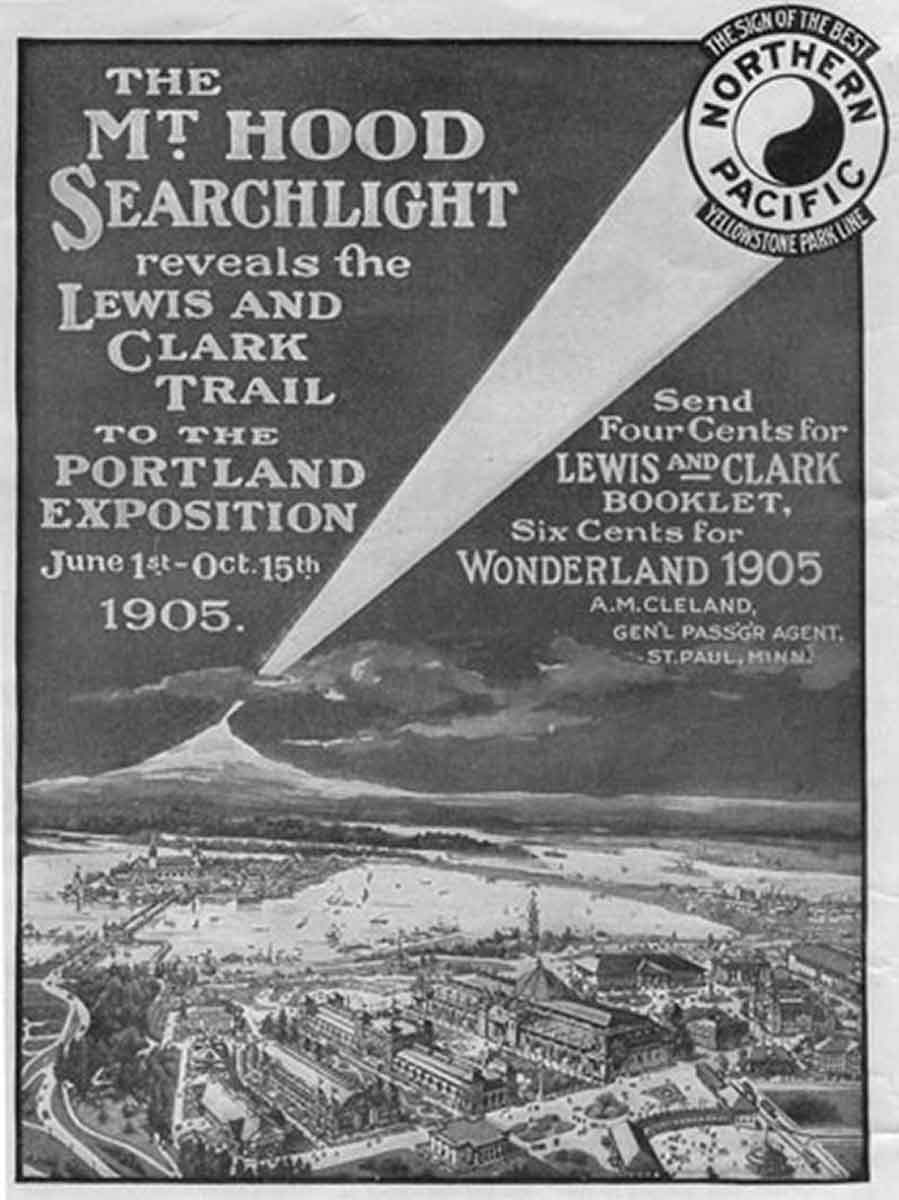 When Portland planned the Lewis and Clark Centennial Exposition of 1905, some dreamed of grand summit lights. Organizer W.M. Killingsworth even floated the idea of illuminating two giant statues—Lewis on one side of the mountain and Clark on the other—powered by electricity from nearby streams. The concept was impossible to execute, but “Plan B” was set in motion.