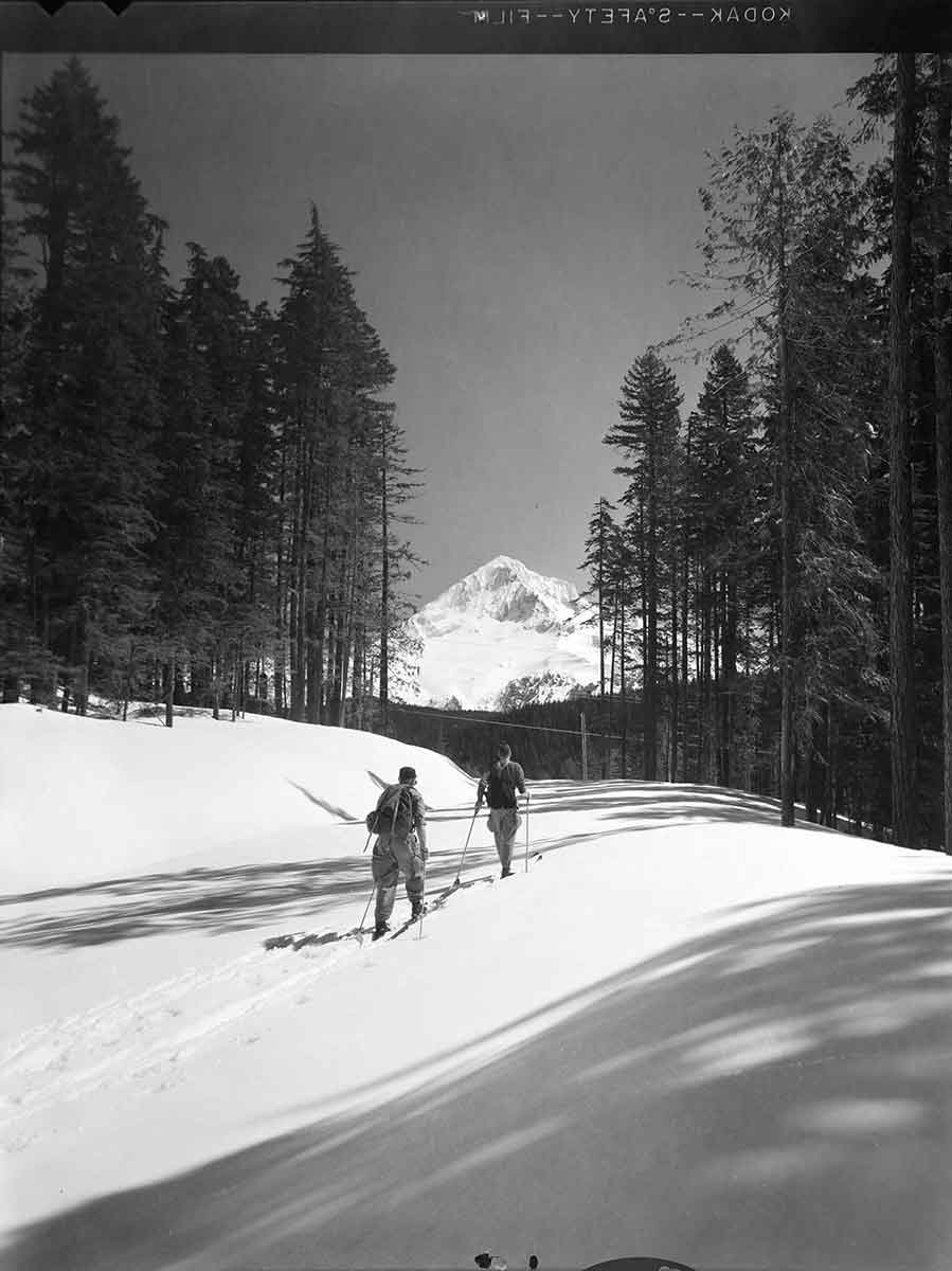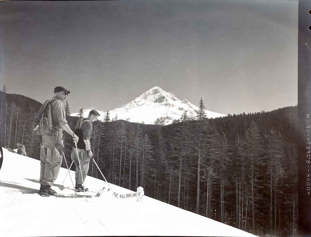 The photos reveal a breathtakingly clear view of Mount Hood in the distance. The skiers appear well-prepared for their journey, and one detail stands out—they seem to have access to a gated road, an unusual privilege even at the time. One image even includes a sign marking the Bull Run Lake Trail, a landmark that helps confirm their location.