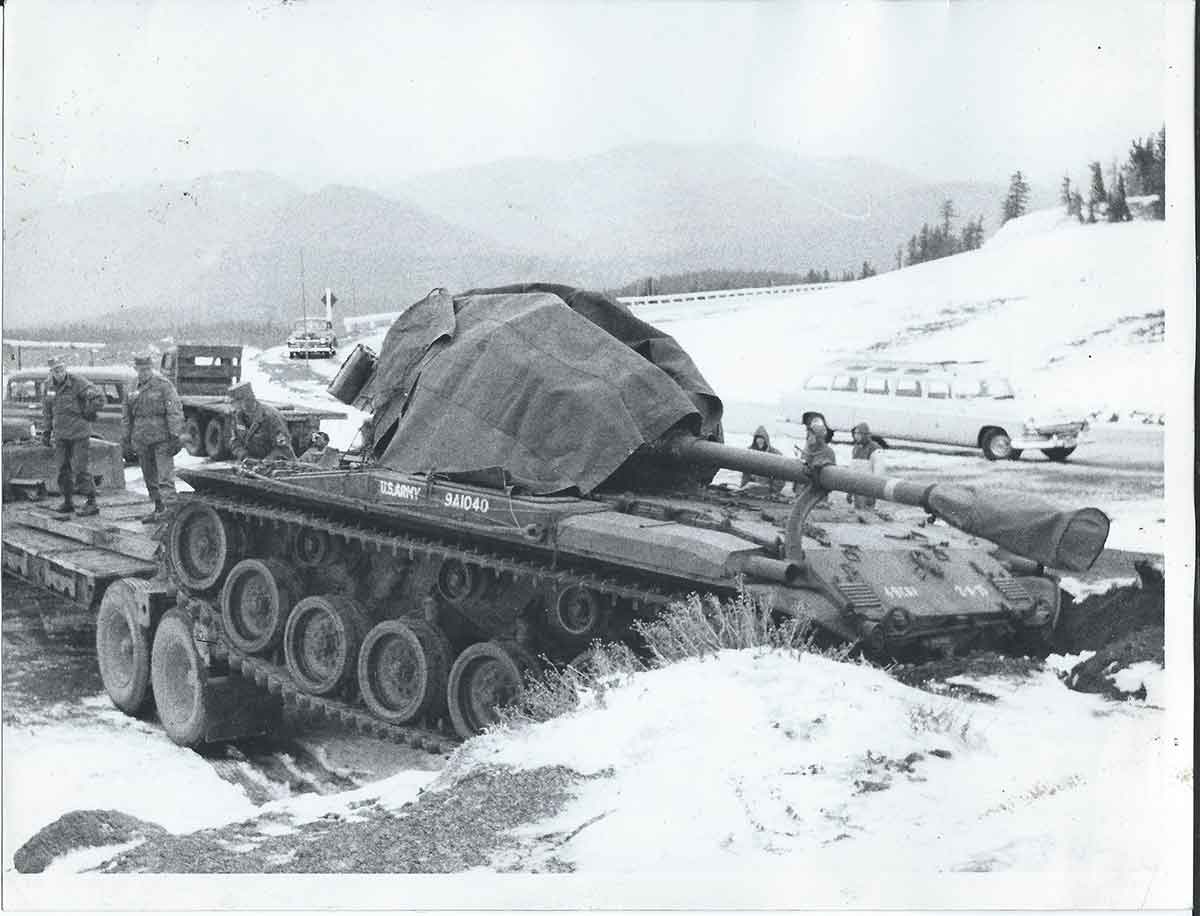 Transporting M-41, 26-ton tank from Fort Lewis, Wash., to Timberline Lodge, to be used in Korean war film being shot on location, this week provided side drama. Aboard a truck, the tank was stopped at the Oregon border as legally too heavy for Oregon highways. A bigger truck finally made transport.