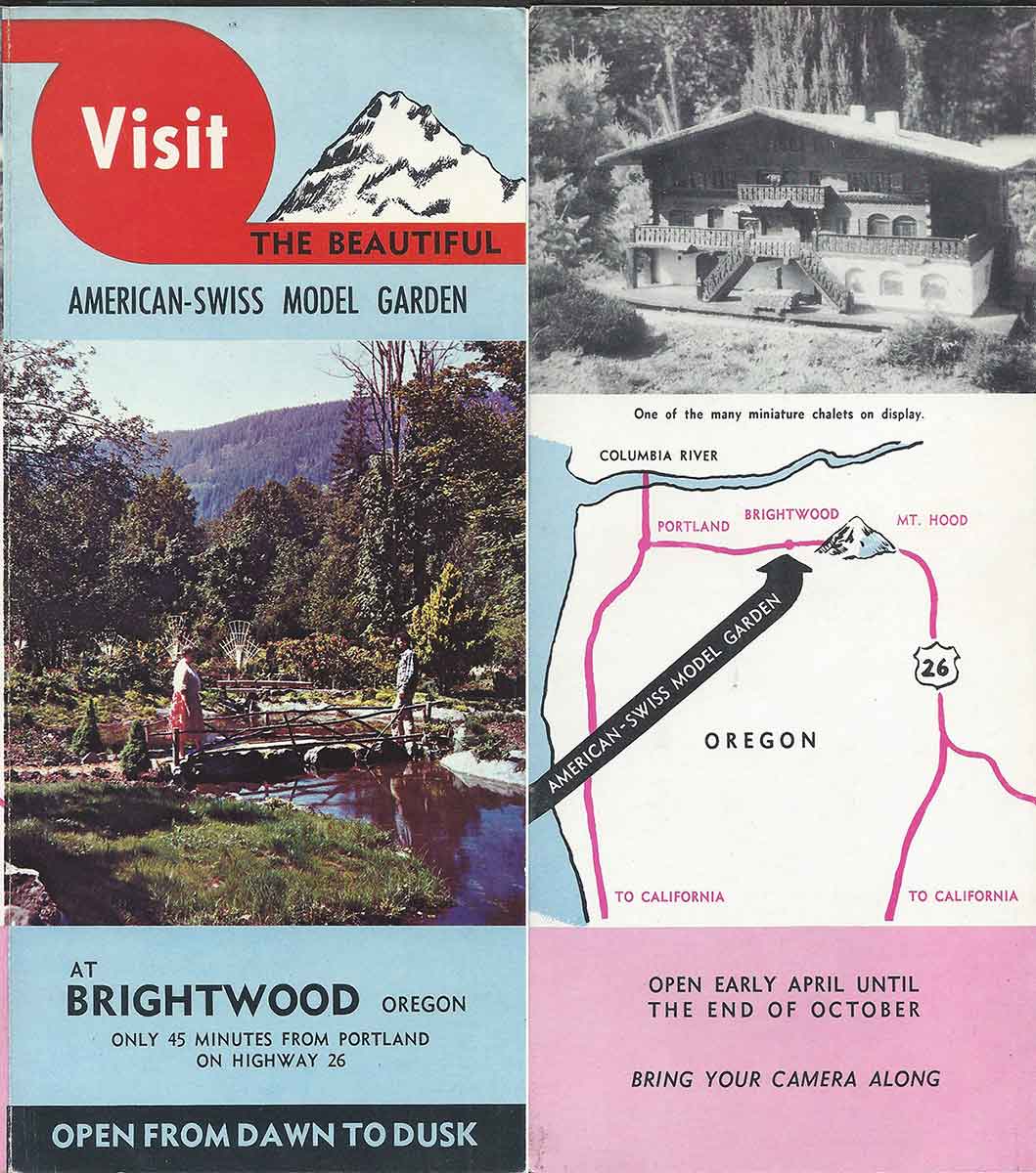 This is only one of many small businesses and tourist themed stopping spots along the highway to Mount Hood in the 1940-1960’s. This is an old flyer advertising the American – Swiss Model Garden at Brightwood, Oregon.