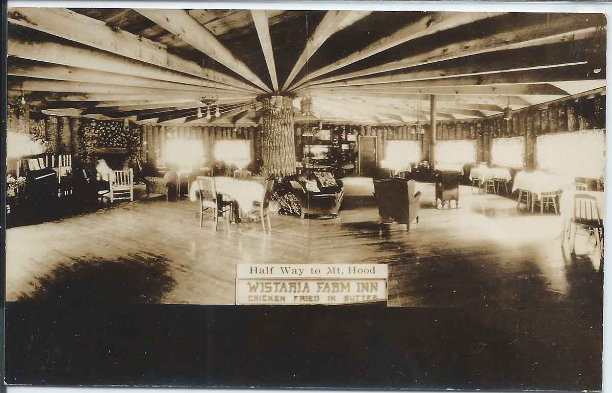 In 1926, Frost relocated to an 86-acre farm along the Mount Hood Scenic Highway, about 30 miles east of Portland. Three years later, he built a unique log inn, naming it the “Wistaria Farm Inn.” His restaurant quickly gained a statewide reputation for its signature dish, “Chicken Fried in Butter.”